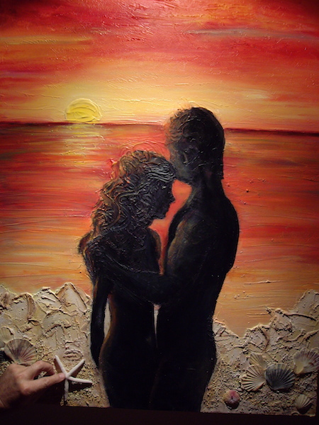 This painting was created in oil with real sand and shells added. The image represents my daughter with her newly wed husband in a honeymoon setting