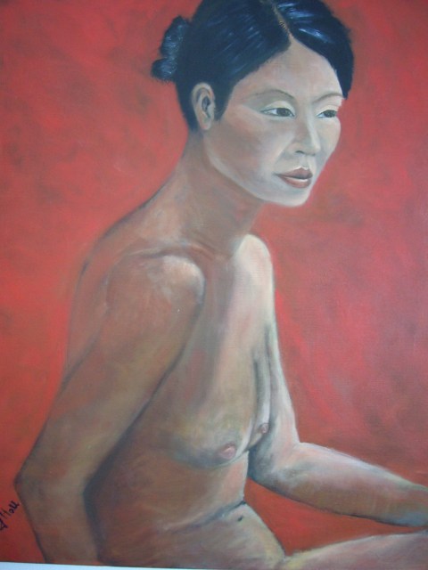This is an experiment. A first attempt at newspaper art. The canvas is large 48″ x 24″. French newspaper is first glued to the canvas. Then interesting clippings from various french books are added. It is sealed then the figure is drawn in charcoal and sealed. Then painted firstly in acrylic and finished in oil.