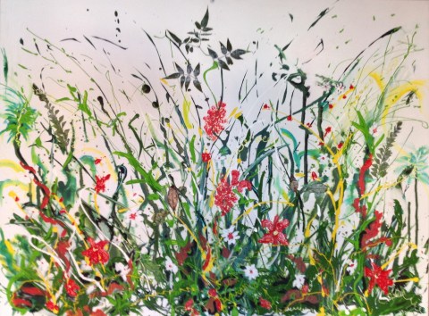 I tried to create the feeling of being in a wild colourful garden. Using mixed media of acrylic and oil and with real leaves and foliage added in areas. It was a fun piece to create by pouring straight from the tube to create colours with texture. The flowers are added by pallet knife.